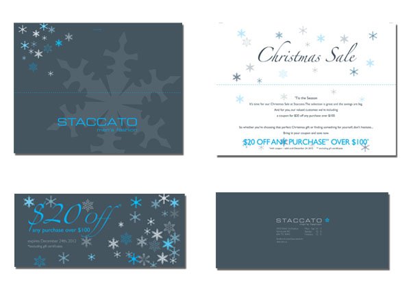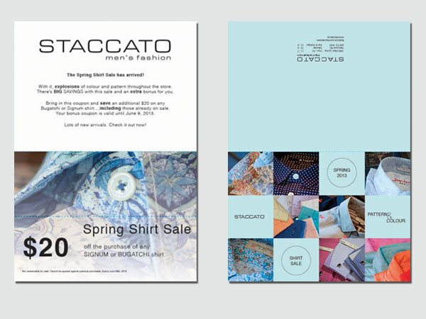 For over 30 years, Staccato has defined the standard for premium menswear in Greater Vancouver. To match the sophisticated aesthetic of brands like Ted Baker and Tiger of Sweden, I developed a suite of marketing assets designed to drive foot traffic and maintain brand loyalty. This included the conceptualization and design of immersive in-store posters, as well as direct mailers and coupon sets for their seasonal sales.